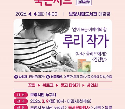 보령시는 4월 4일 토요일 오후 2시 보령시립도서관 대강당에서 베스트셀러 『긴긴밤』의 저자 루리 작가를 초청해 북콘서트를 개최한다고 밝혔다. 2024년을 시작으로 3년째를 맞는 보…