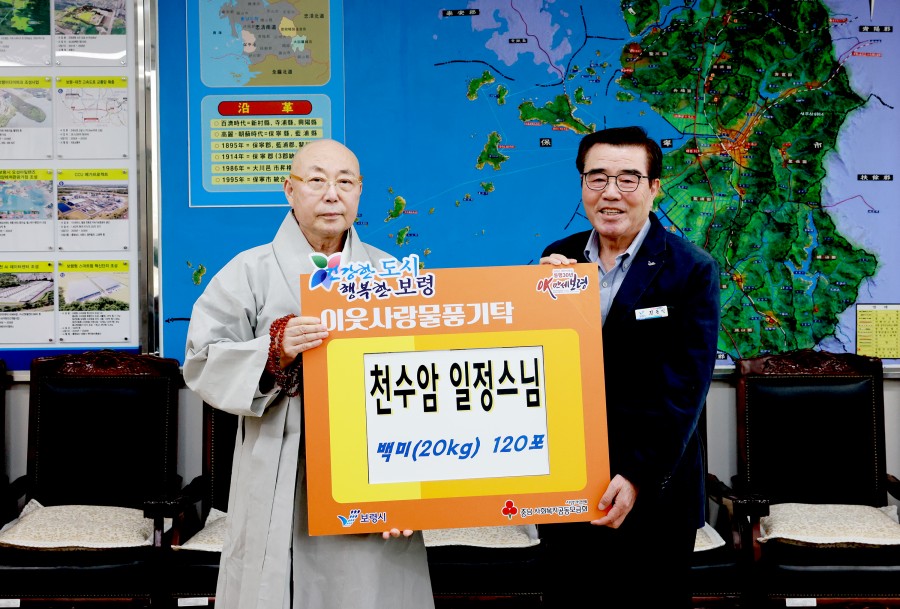 김동일 보령시장은 매년 잊지 않고 이웃사랑을 실천해 주시는 천수암 일정스님과 관계자분들께 깊은 감사를 드린다기탁받은 백미는 기부자의 따뜻한 마음을 담아 도움이 필요한 이웃들에게 소중히 전달하겠다고 말했다.