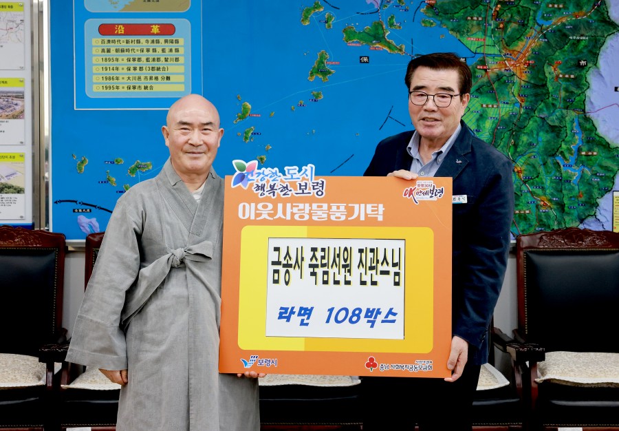 보령시는 27일 시장실에서 김동일 보령시장과 삽시도 금송사 죽림선원 진관스님 등 관계자가 참석한 가운데 이웃사랑 후원물품 전달식을 가졌다고 밝혔다.