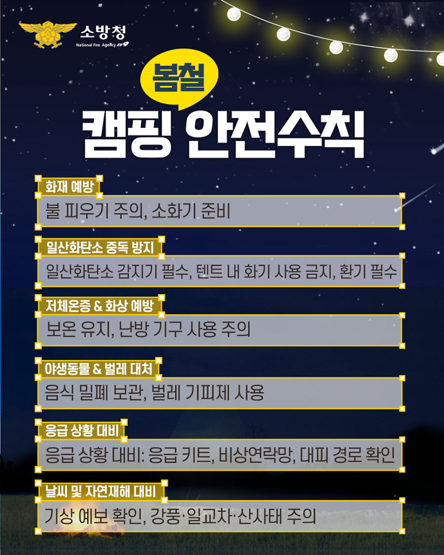 이에 보령소방서는 캠핑 중 발생할 수 있는 안전사고 예방을 위해 지정된 장소에서만 화기 사용 취사·모닥불 사용 시 주변 가연물 점검 및 소화기 준비 텐트 내부 화기·난방기구 사용 자제, 환기 철저 및 일산화탄소 감지기 설치 기상 예보 사전 확인 및 강풍·일교차 등 기상 변화 대비 등의 안전수칙을 안내했다.