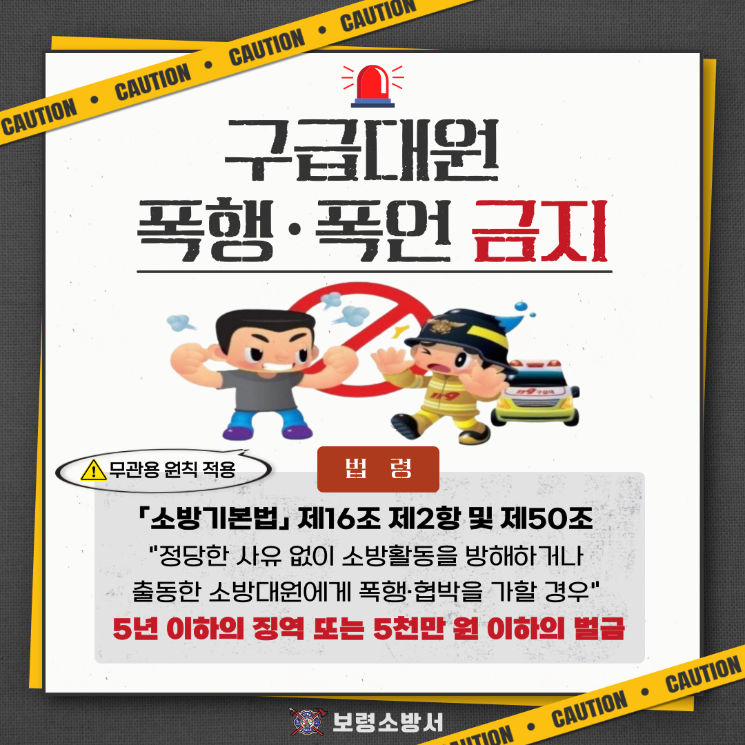 보령소방서(서장 고광종)는 구급대원에 대한 폭언·폭행 행위의 심각성을 알리고 안전한 현장 활동 여건을 조성하기 위해 시민 홍보를 강화하는 한편, 무관용 원칙을 바탕으로 엄정히 대응하겠다고 밝혔다.