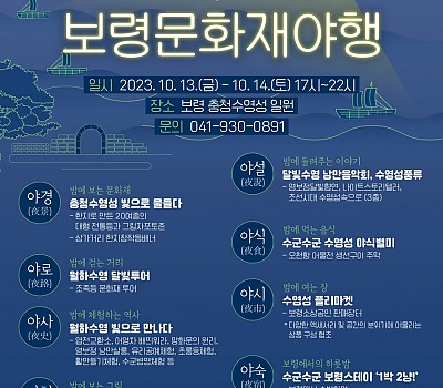 - 오는 13~14일 보령 충청수영성 일원에서 개최 보령시는 오는 13일, 14일 양일간 조선 5대 수영 중 하나인 보령 충청수영성 일원에서 ‘2023 보령 문화재 야행’을 개최한…