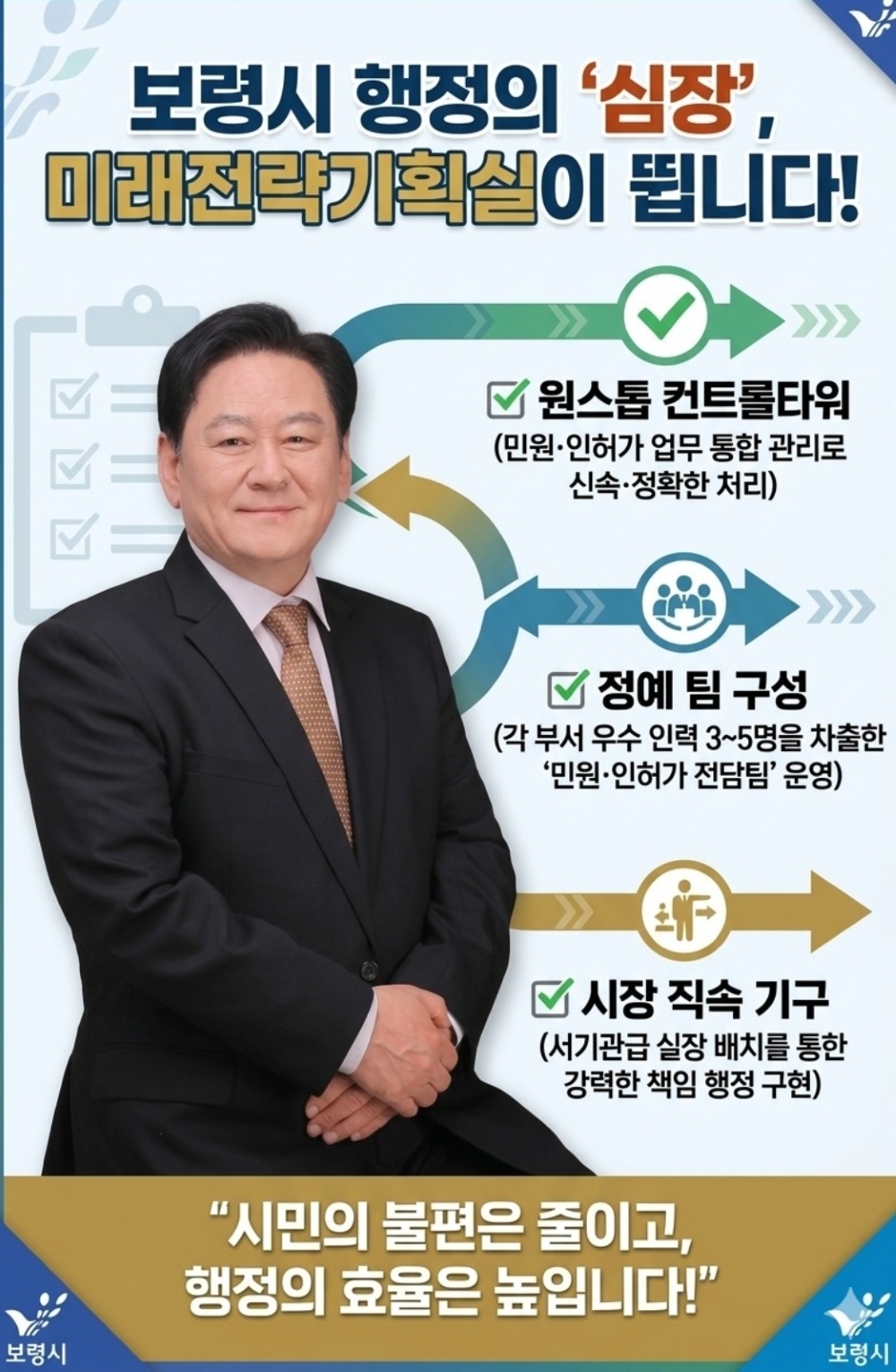 - 미래전략기획실(미전실) 신설을 통한 원스톱 행정 혁신 공약 무소속 김흥식 보령시장 예비후보가 발표한 ‘미래전략기획실(미전실)’ 신설 공약은 단순한 조직 개편을 넘어 행정 운영 … 더보기