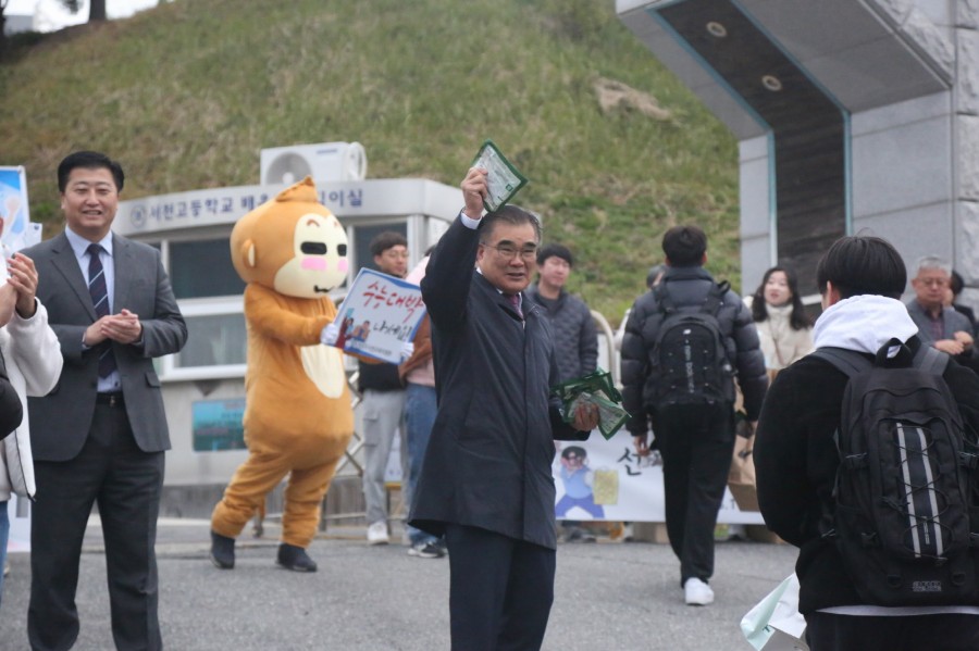 2024학년도 대학수학능력시험일인 16일 수험생들을 격려하기 위해 이른 아침부터 서천여자고등학교와 서천고등학교를 찾은 김기웅 서천군수가 밝은 표정으로 핫팩을 나눠주며 수험생들을 응원했다.