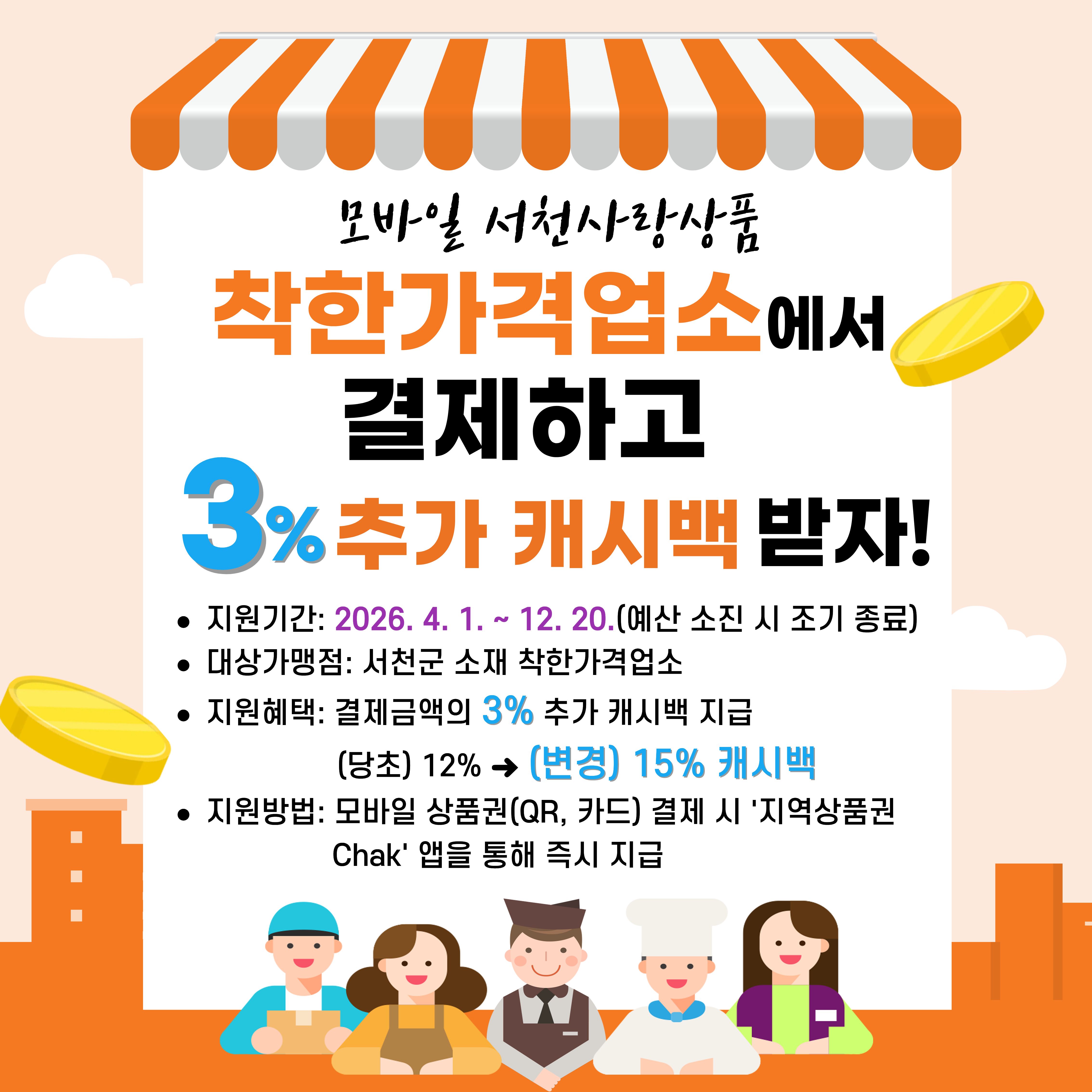 이번 사업에 따라 착한가격업소에서 모바일(카드) 서천사랑상품권으로 결제할 경우, ‘지역사랑상품권 Chak’ 앱을 통해 결제금액의 3%를 추가 캐시백으로 지원받을 수 있다.