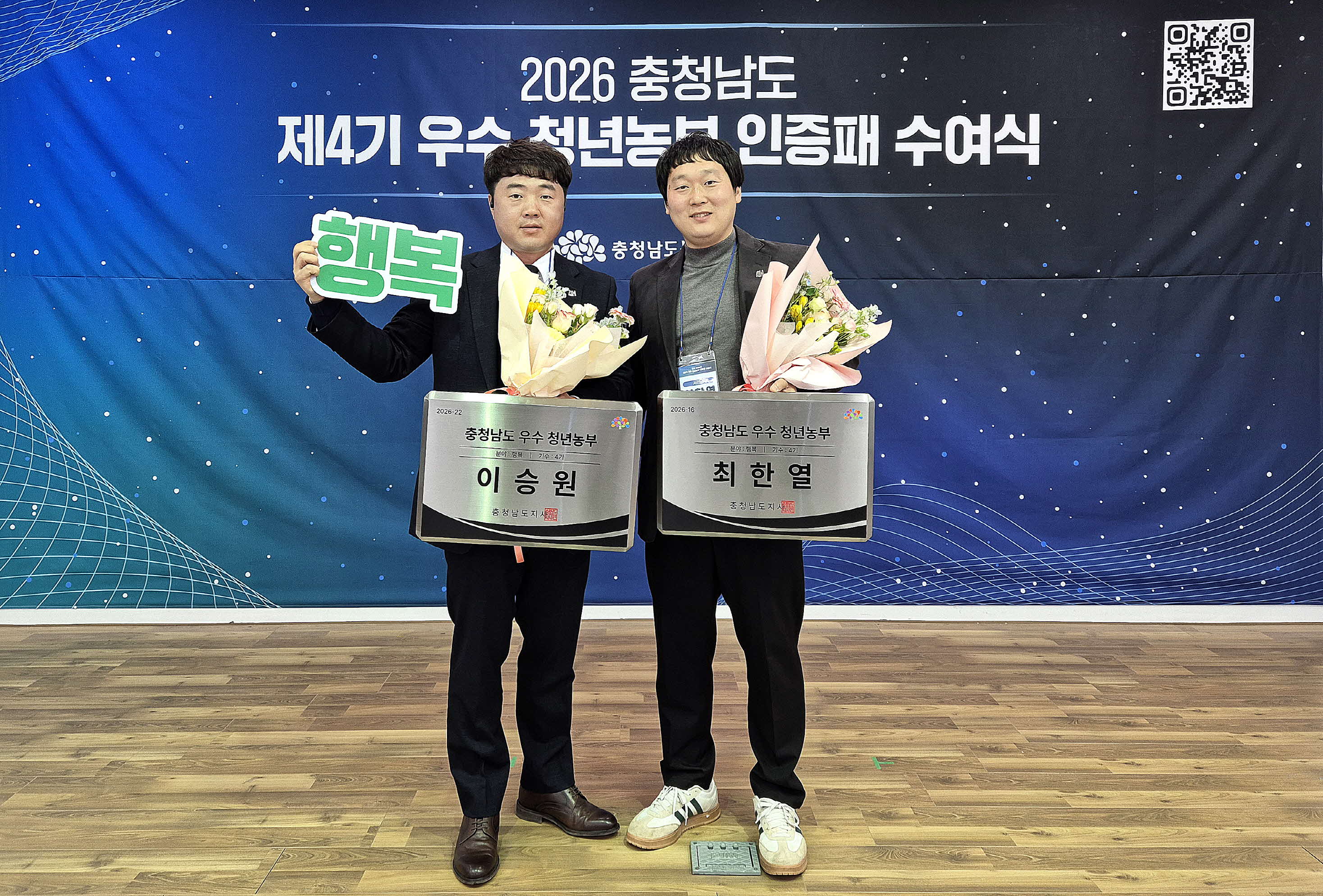 서천군농업기술센터는 지난 2일 충청남도농업기술원에서 열린 ‘제4기 충남 농업 미래리더 인증식’에서 서천군 청년농업인 최한열 씨와 이승원 씨가 충청남도 우수청년농부 인증패를 수상했다고 밝혔다.