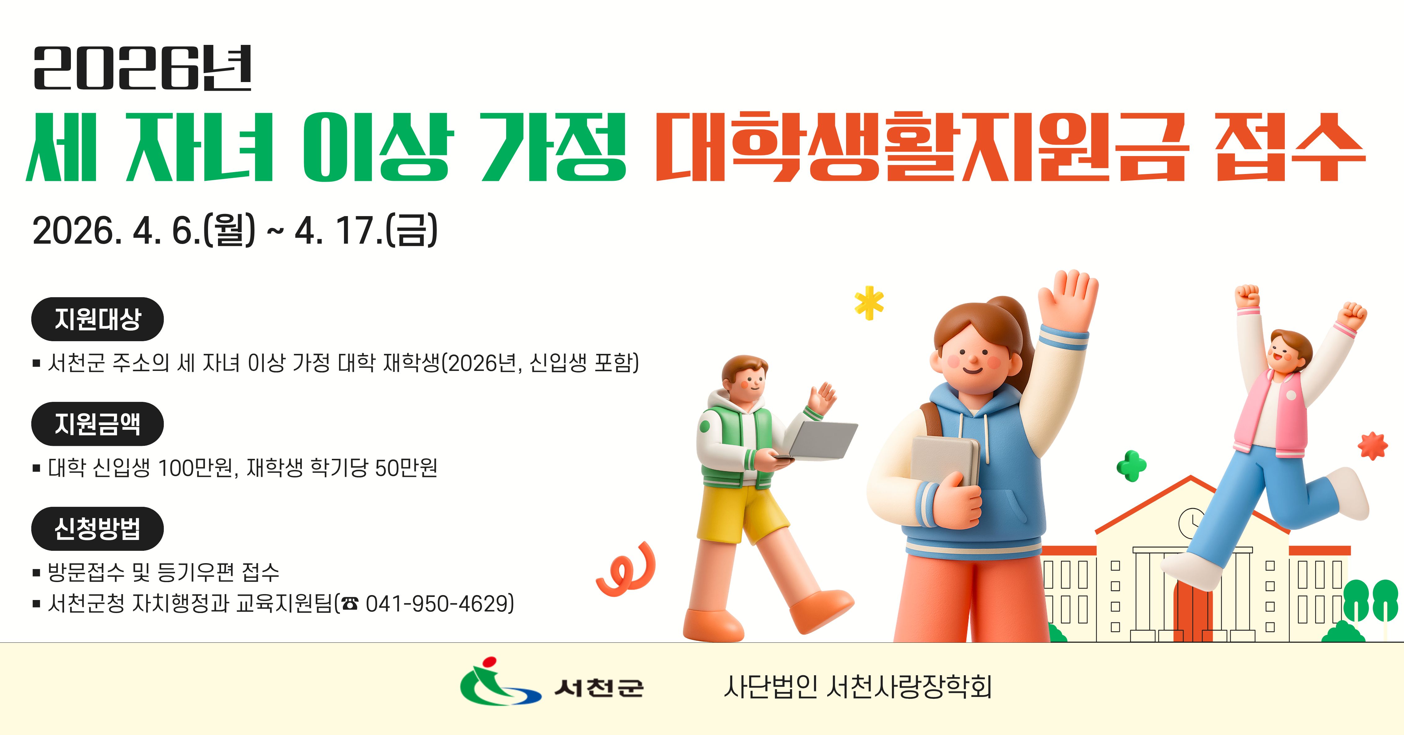 (사)서천사랑장학회는 ‘2026년도 상반기 세 자녀 이상 가정 대학생활지원금 지원계획’을 공고하고, 오는 4월 6일부터 17일까지 2주간 지원 신청을 받는다.