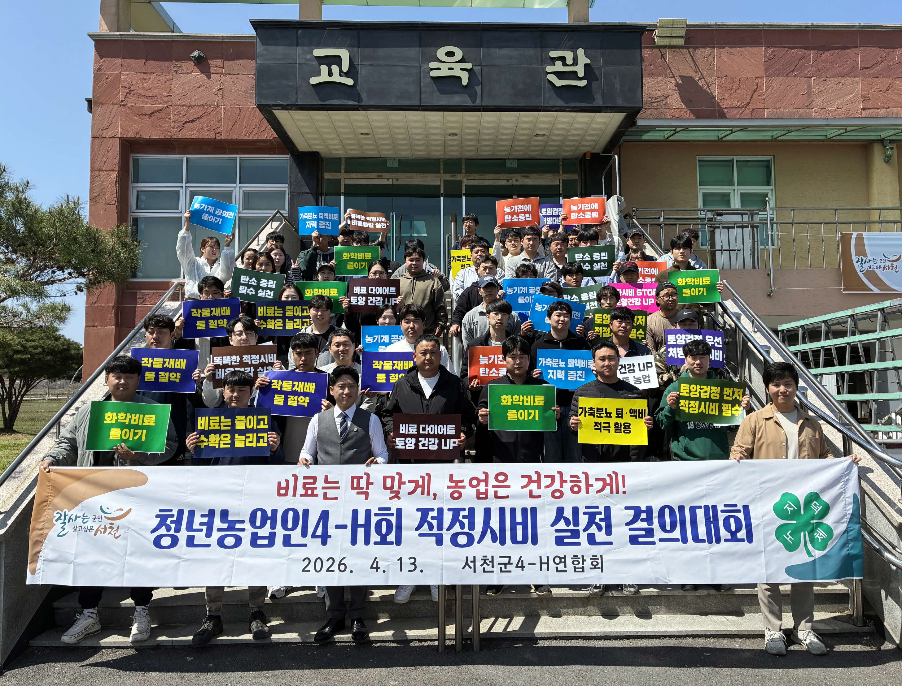 서천군농업기술센터는 지난 13일 센터 교육장에서 서천군4-H연합회 회원 69명이 참석한 가운데 중동 정세 불안에 따른 무기질 비료 수급 차질에 대응하기 위한 ‘적정시비 실천 결의대회’를 개최했다.