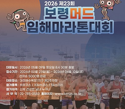 보령시는 모두가 건강한 생활체육 도시를 목표로 ‘2026년 제23회 보령머드임해마라톤 대회’ 참가자 모집에 나섰다. 보령시육상연맹이 주관하는 이번 대회는 오는 5월 9일 대천해수욕…