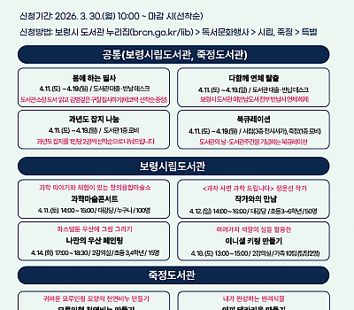 - 공연, 강연, 체험, 독서 이벤트 운영 보령시는 2026년 도서관의 날·도서관주간을 맞아 보령시 도서관에서 공연, 강연, 체험, 독서 이벤트 등 다채로운 문화행사를 진행한다고 …