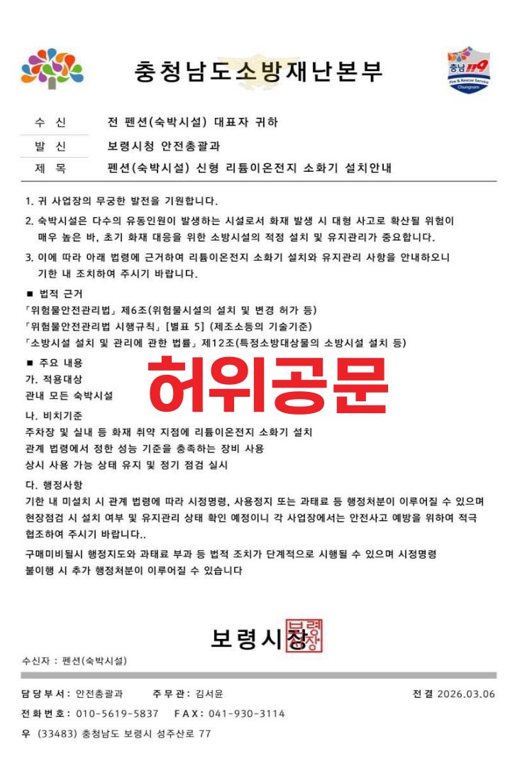 보령소방서에도 지난 6일 ‘리튬이온전지 소화기 및 질식소화포 설치 안내 공문’의 사실 여부를 확인하는 문의 전화가 두 차례 접수되는 등 소방기관을 사칭한 사기 시도가 이어지고 있는 것으로 파악됐다.