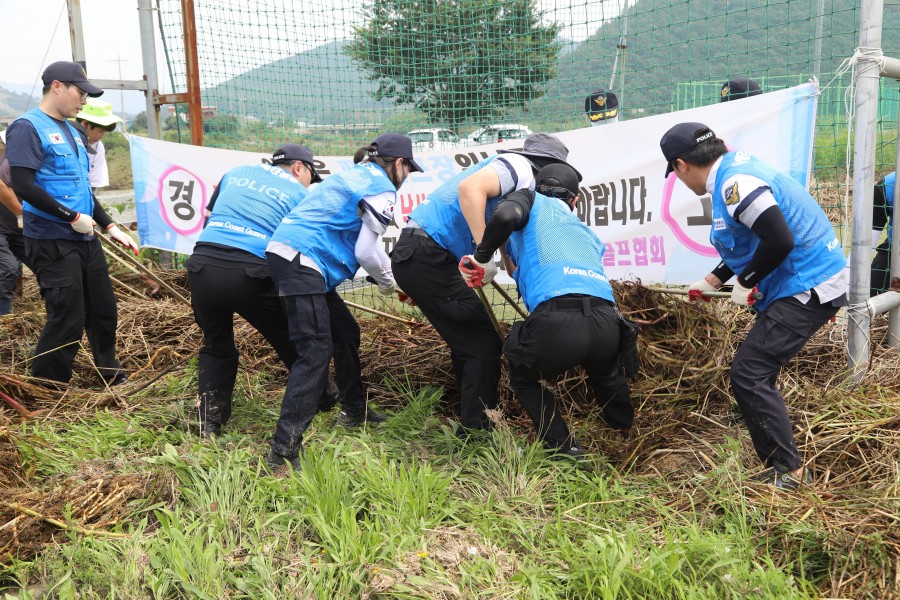 보령해양경찰서는 오늘(20일) 13:30경 웅천천 범람으로 피해를 입은 보령시 웅천읍 노천리 체육공원 일대에서 서장 등 직원 30명이 복구 작업에 나섰다고 밝혔다.