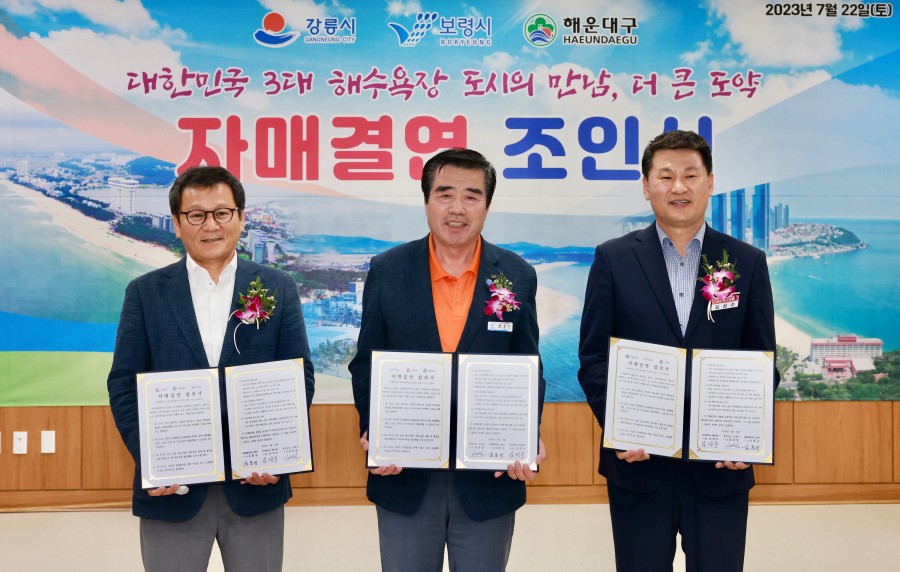 전국 3대 해수욕장으로 유명한 보령시와 강릉시, 해운대구는 22일 보령머드테마파크에서 김동일 보령시장과 김홍규 강릉시장, 김성수 해운대구청장, 관계 공무원 등 50여 명이 참석한 가운데 자매결연 조인식을 가졌다.
