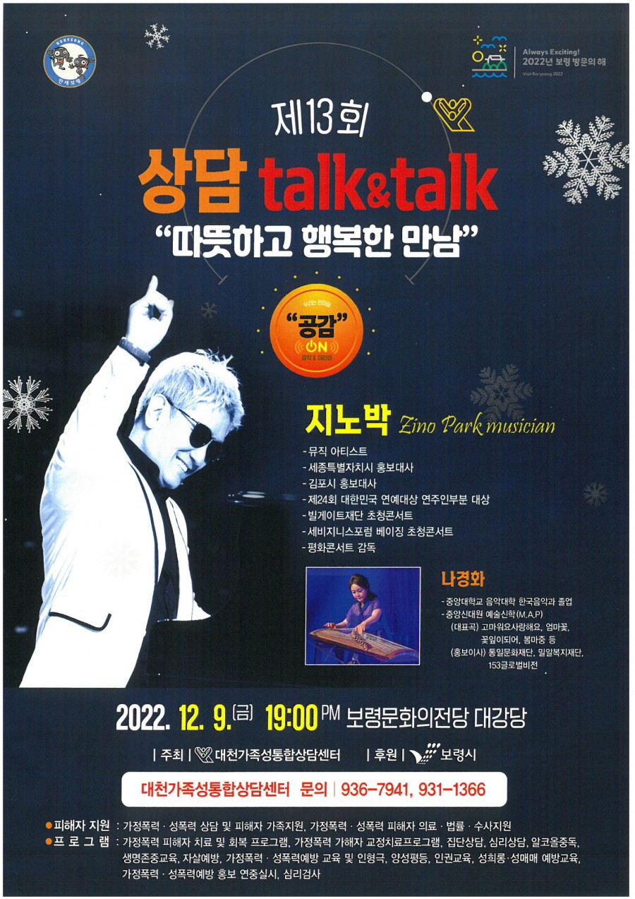 보령시는 9일 오후 7시 보령문화의전당 대강당에서 대천가족성통합상담센터(센터장 박점옥) 공동주관으로 따뜻하고 행복한 만남13회 상담 talk & talk’행사를 개최했다.
