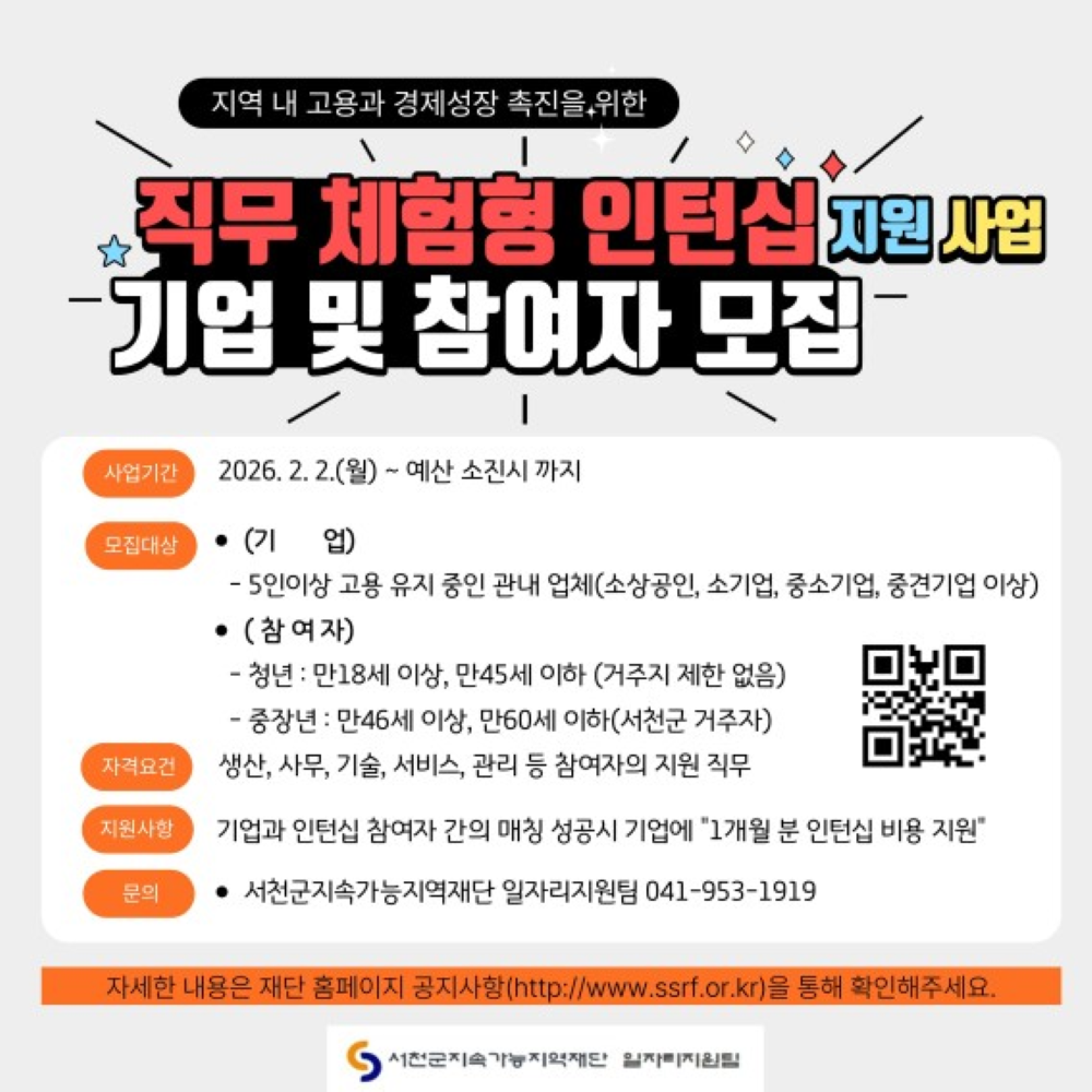 한편, 직무 체험형 인턴십 지원사업에 대한 세부 내용과 참여 방법은 서천군지속가능지역재단 공식 홈페이지를 통해 확인할 수 있다.