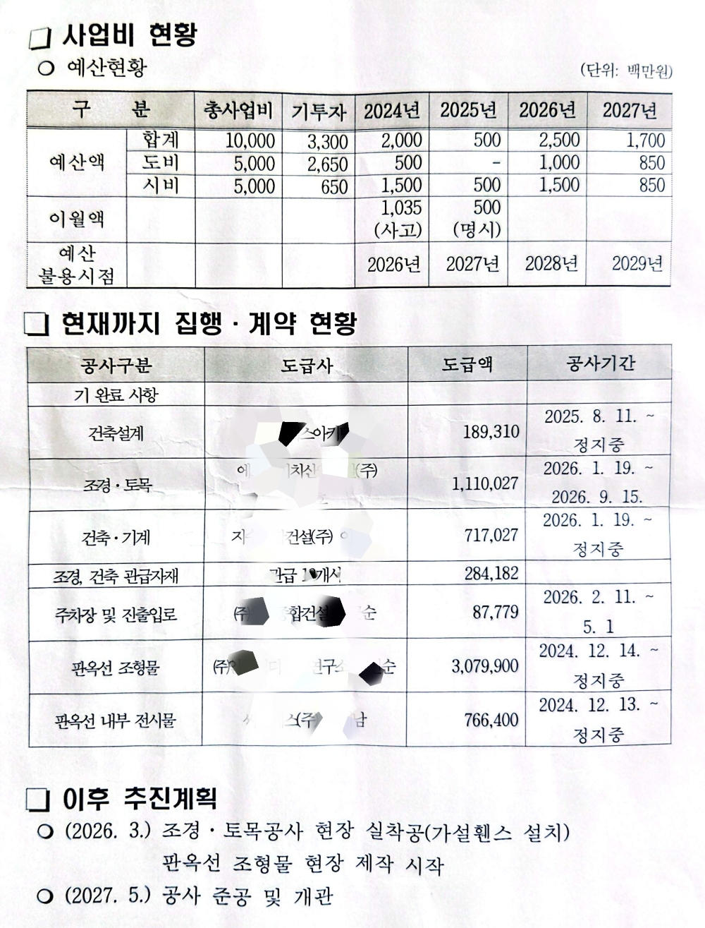 반면 조경·토목 및 일부 기반 공사는 일정이 명시돼 있다.