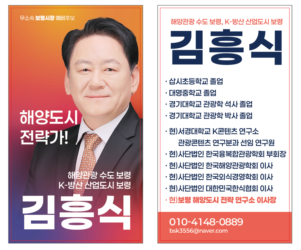한편, 김흥식 예비후보는 경기대학교 관광전문대학원에서 관광학 석사·박사 학위를 취득하고, ()한국융복합관광학회 부회장 및 보령 해양도시 전략연구소 이사장 등을 역임하며 학계와 실무를 아우르는 해양도시 정책 전문가로 평가받고 있다.