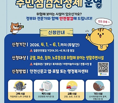 서천군은 ‘2026년 집중안전점검’을 앞두고 안전관리 사각지대 해소를 위해 ‘주민 점검 신청제’를 운영한다. 주민점검 신청제는 주민들이 점검 대상 시설물을 요청하면 공무원이 민간 …