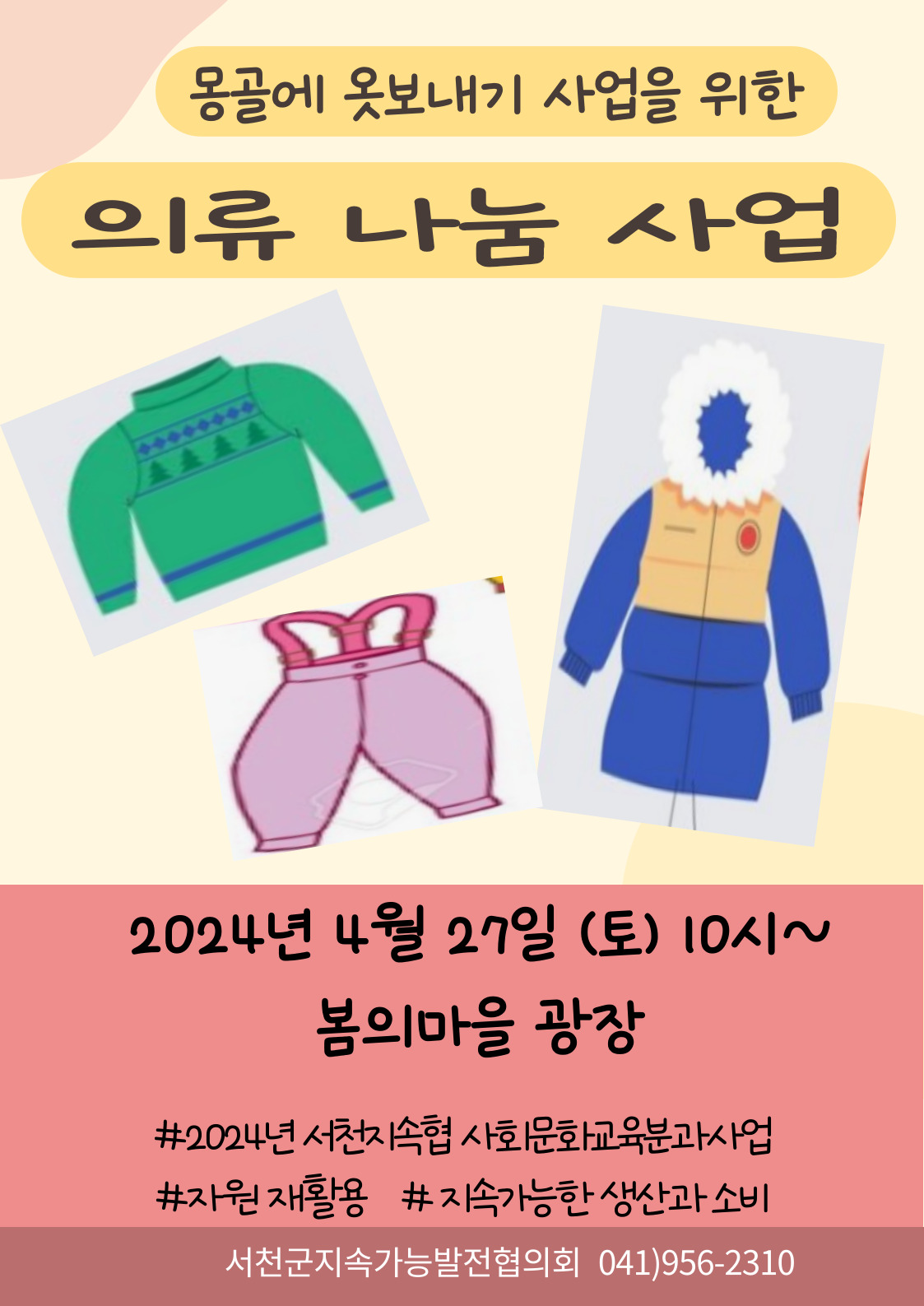서천군지속가능발전협의회(대표 신상애)는 오는 27일 서천 봄의마을 광장 에서 몽골의 어려운 이들에게 보낼 줄 의류 수거 사업을 진행한다.