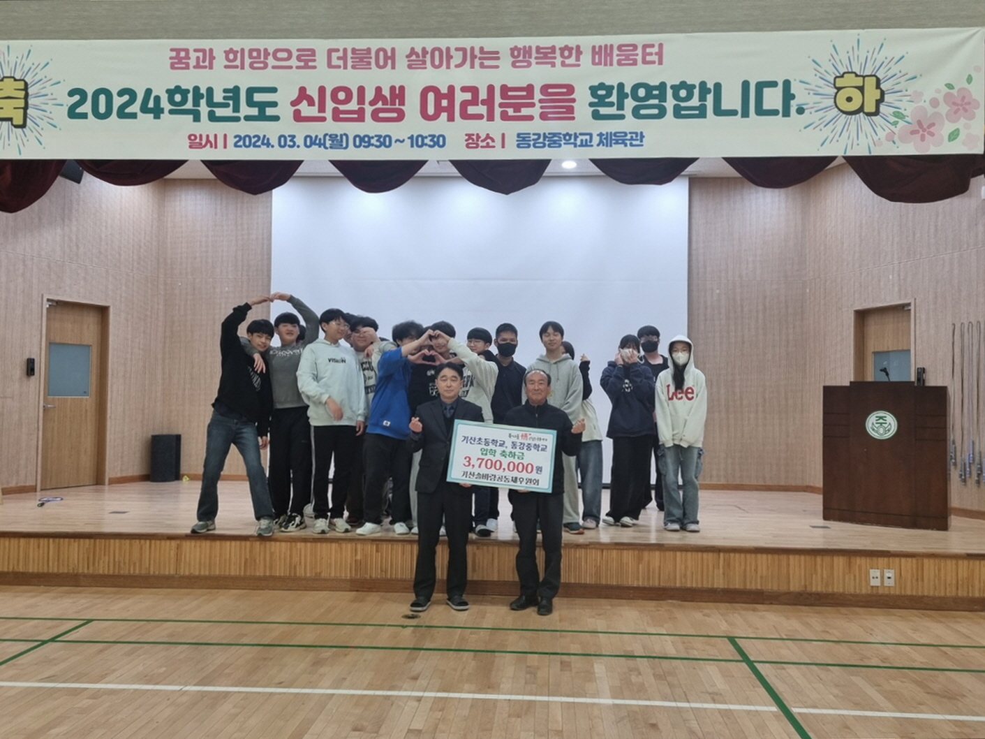 이날 후원회는 입학축하금 수여식에서 기산초등학교 입학생 5명과 동강중학교 입학생 32명에게 각 50만원과 320만원을 전달했다.