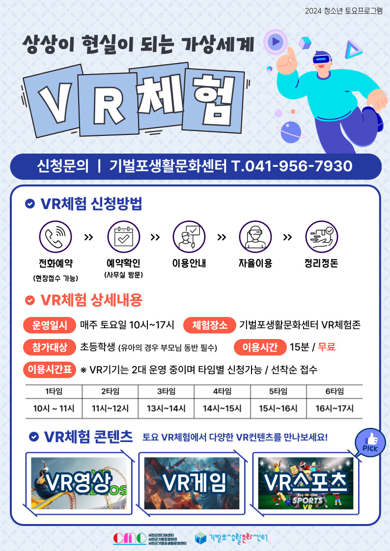 VR 체험존 이용에 대한 자세한 사항은 기벌포생활문화센터 전화 041) 956-7930 으로 문의를 통해 안내 받을 수 있다.