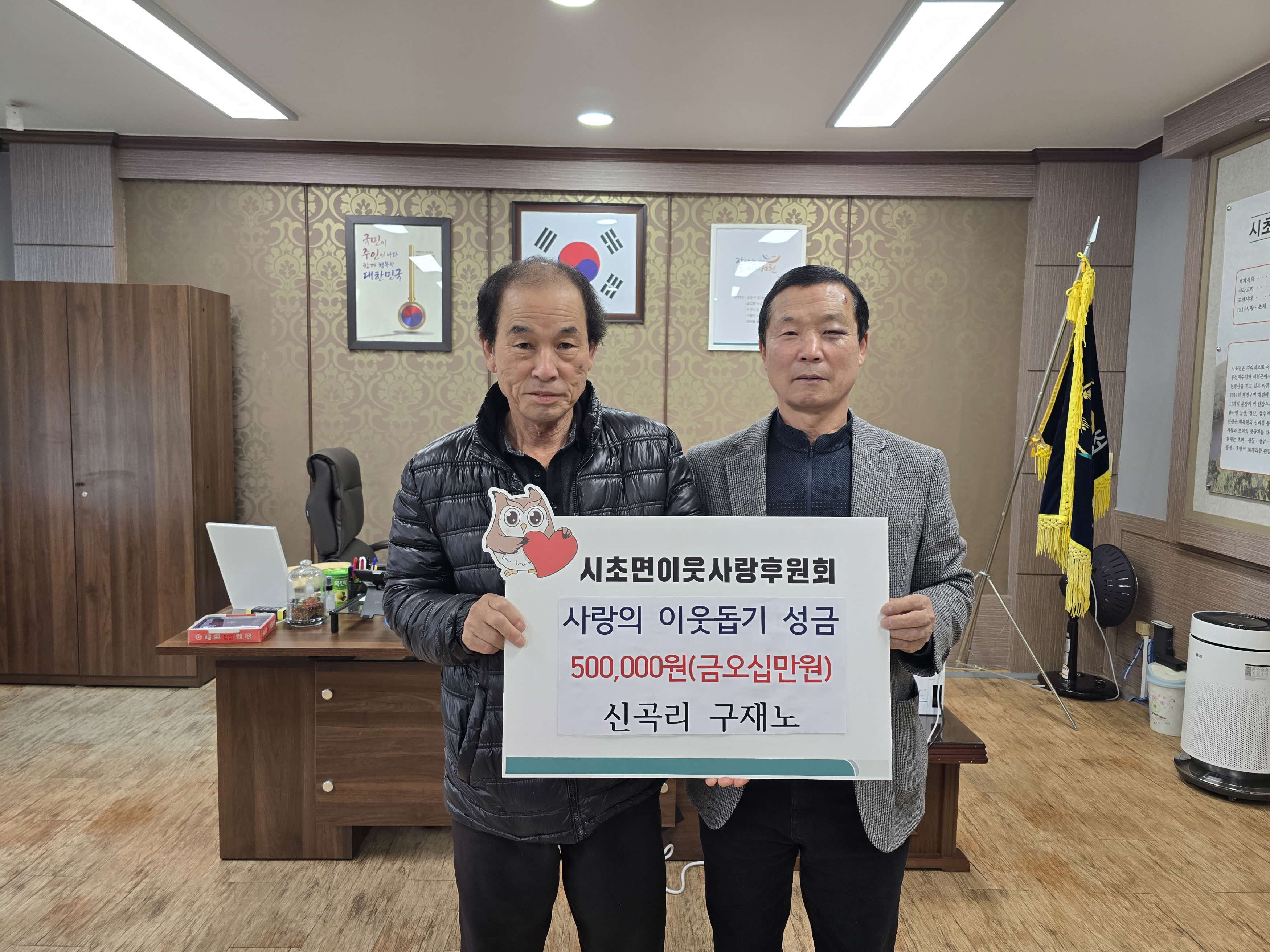 서천군 시초면 신곡리에 거주하는 구재노 씨가 어려운 이웃을 위해 써달라며 성금 50만원을 시초면이웃사랑후원회에 기탁했다.