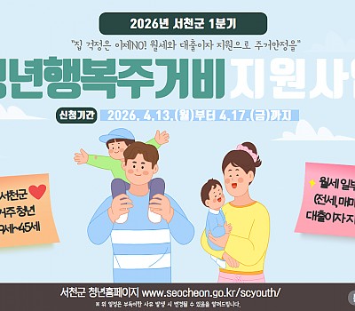 - 오는 13일부터 17일까지…무주택 청년 세대주 대상 - 서천군이 오는 13일부터 17일까지 2026년 1분기 청년 행복주거비 신청을 받는다. 지원 대상은 서천군에 주소를 둔 기…