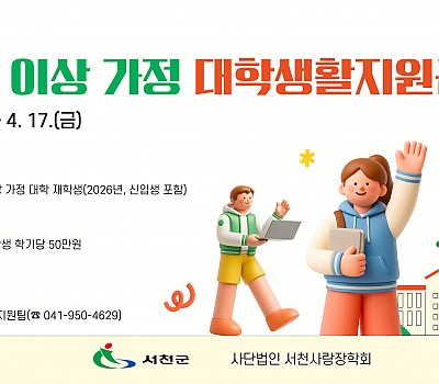 - 신입생 100만원, 재학생 학기당 50만원… 4월 17일까지 신청 접수 - 서천군과 (사)서천사랑장학회가 지역 내 세 자녀 이상 가정의 경제적 부담을 덜고 지역 인재의 교육 기…
