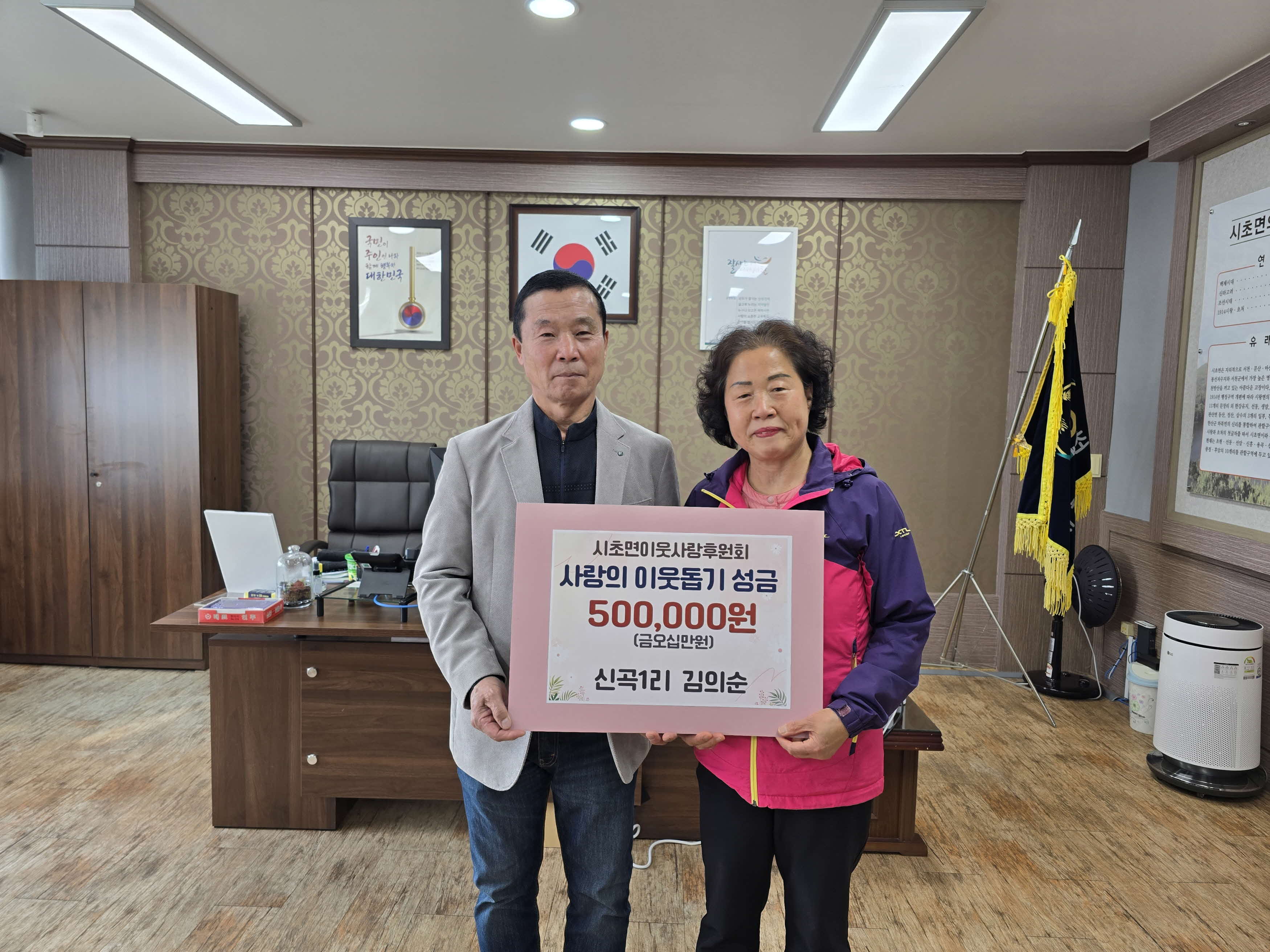 서천군 시초면 신곡1리에 거주하는 김의순 씨가 최근 시초면이웃사랑후원회에 성금 50만원을 기탁하며 지역사회에 따뜻한 나눔을 실천했다.