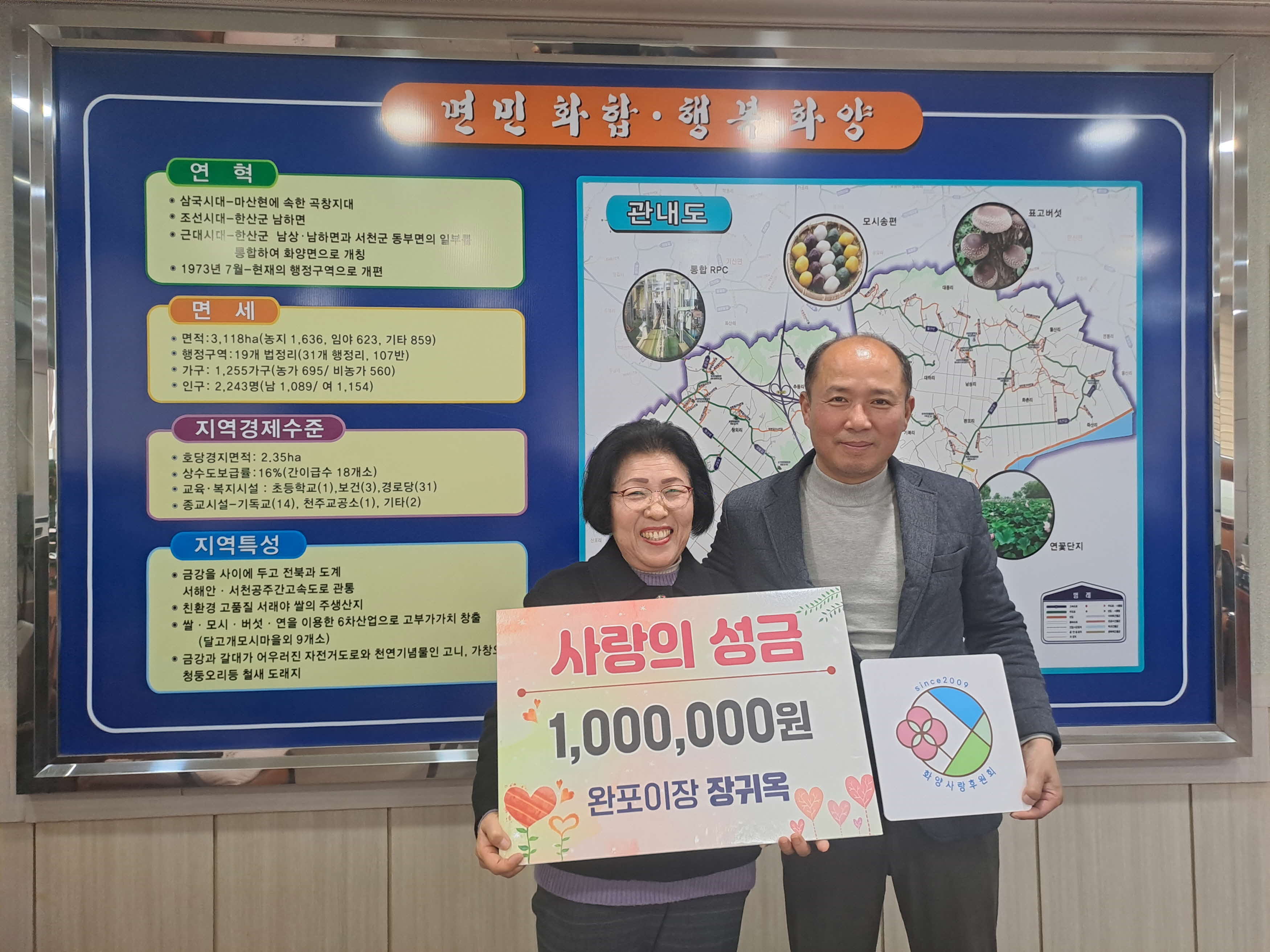 서천군 화양면 완포리 장귀옥 이장은 지난 10일 설 명절을 앞두고 화양사랑후원회에 후원금 100만원을 기탁했다.