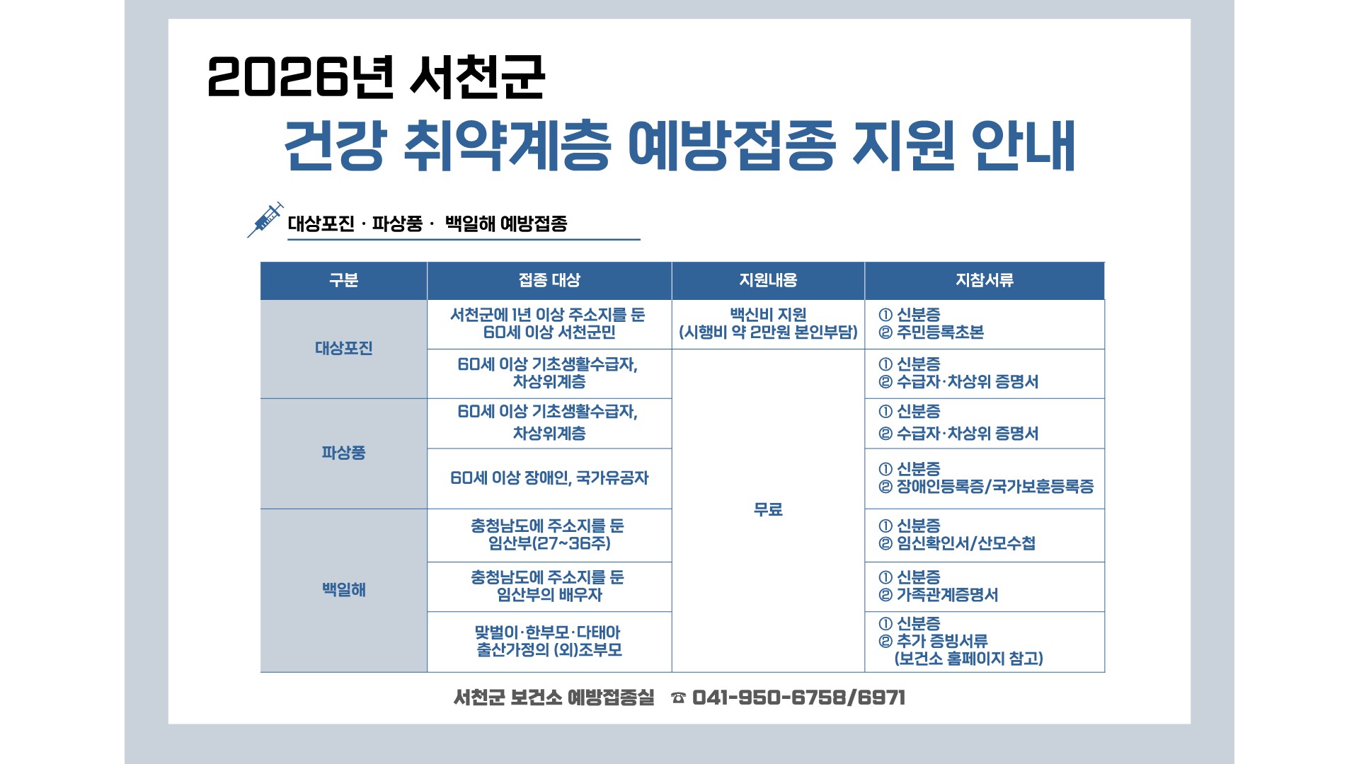 서천군은 고령층과 임산부 등 건강 취약계층을 대상으로 대상포진, 백일해, 파상풍 예방접종 지원사업을 추진하는 가운데 올해 백일해와 파상풍 예방접종 지원 대상을 확대한다고 밝혔다.