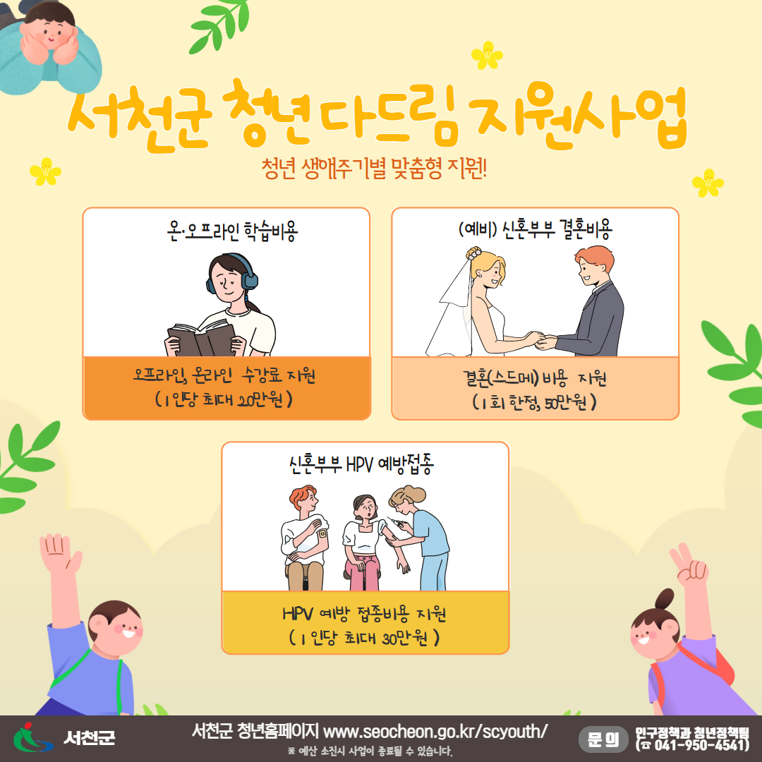 지원 분야는 ▲오프라인·온라인 개인학습비용 ▲예비·신혼부부 결혼비용 ▲신혼부부 HPV 예방접종 비용 등으로, 청년의 생애주기와 수요에 맞춘 맞춤형 지원을 제공한다.